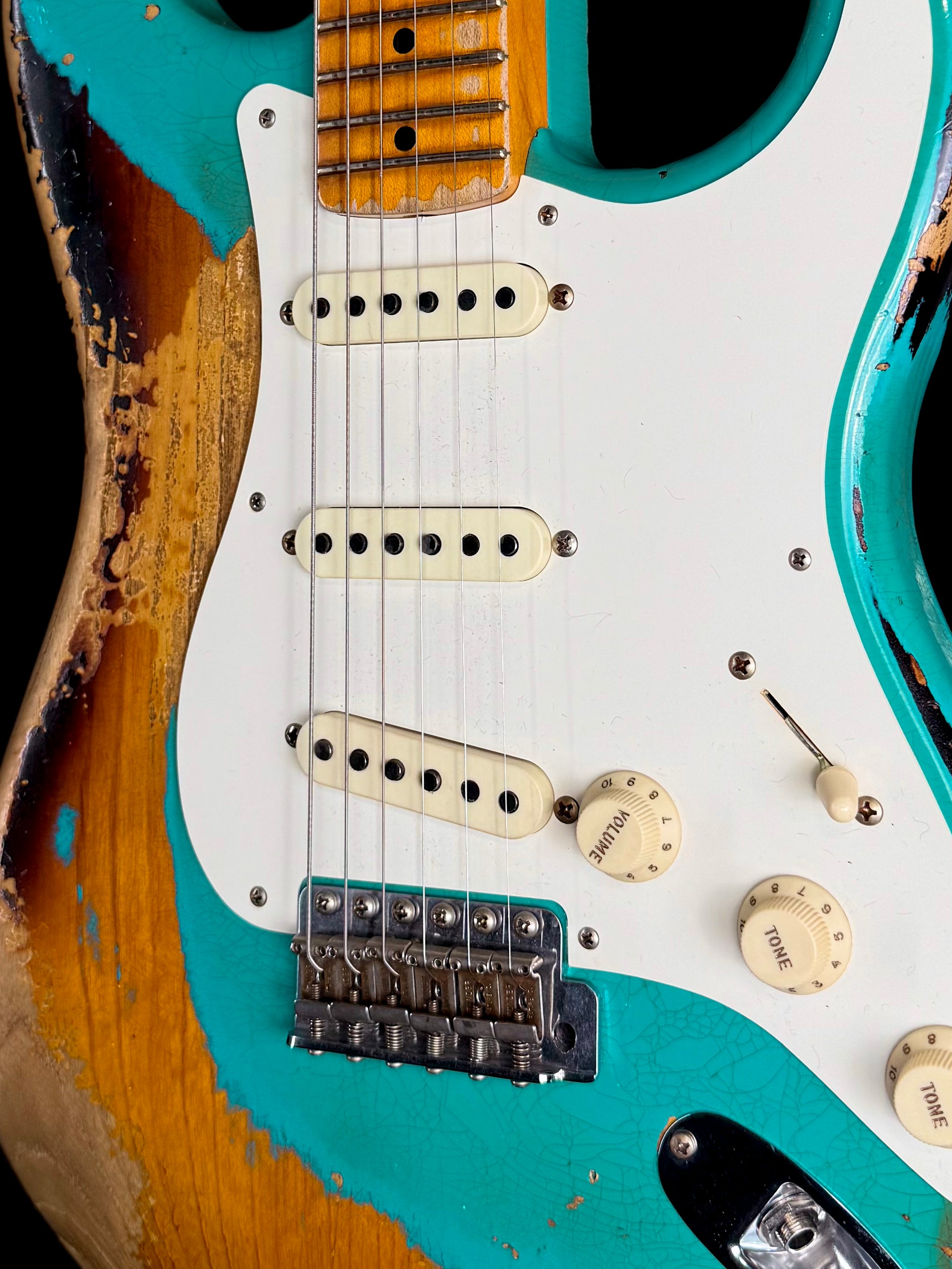 This is a rare & collectible instrument from the Fender Custom Shop’s 2018 NAMM Limited run—crafted to the exacting standards of the ’57 Strat era and presented in a striking Transparent Tahitian Turquoise Over Two-Tone Sunburst heavy relic finish. From the moment you pick it up, it speaks vintage authenticity: the body and neck deliver that classic “Strat” feel, while the heavy relic treatment evokes decades of real road-worn character.
