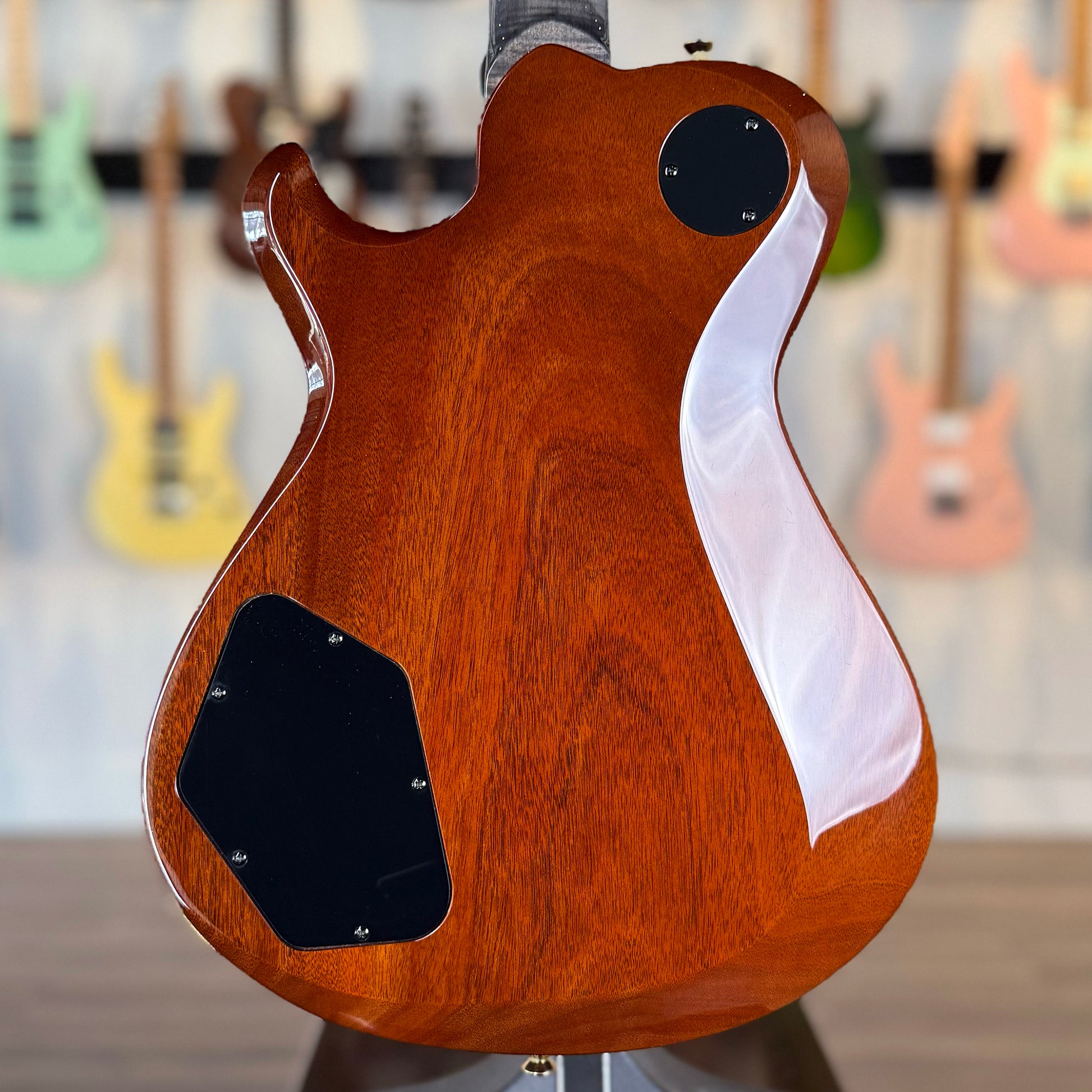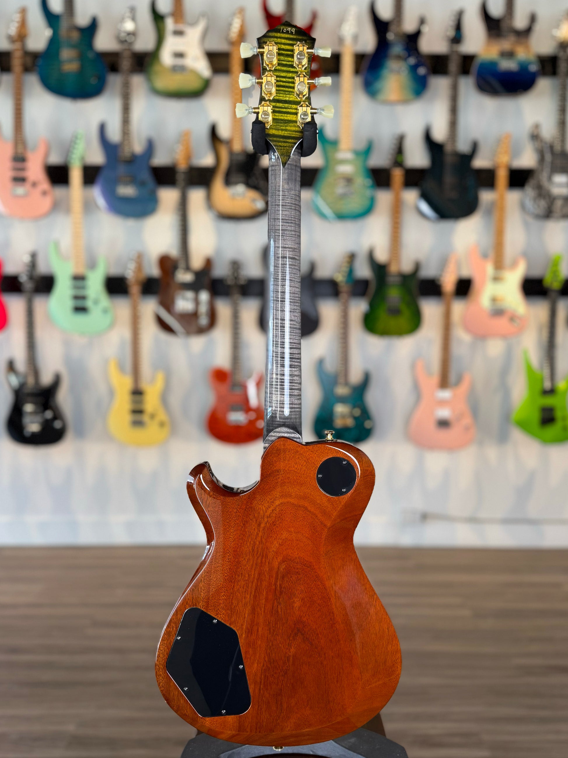 Equally stunning is the curly maple neck that feels incredibly smooth in the hand while highlighting the natural figuring of the wood. It’s a perfect balance of elegance and attitude. You’re also greeted by a subtle pop of green on the back of the headstock — a refined, custom-shop touch that adds personality and reminds you this is anything but ordinary.