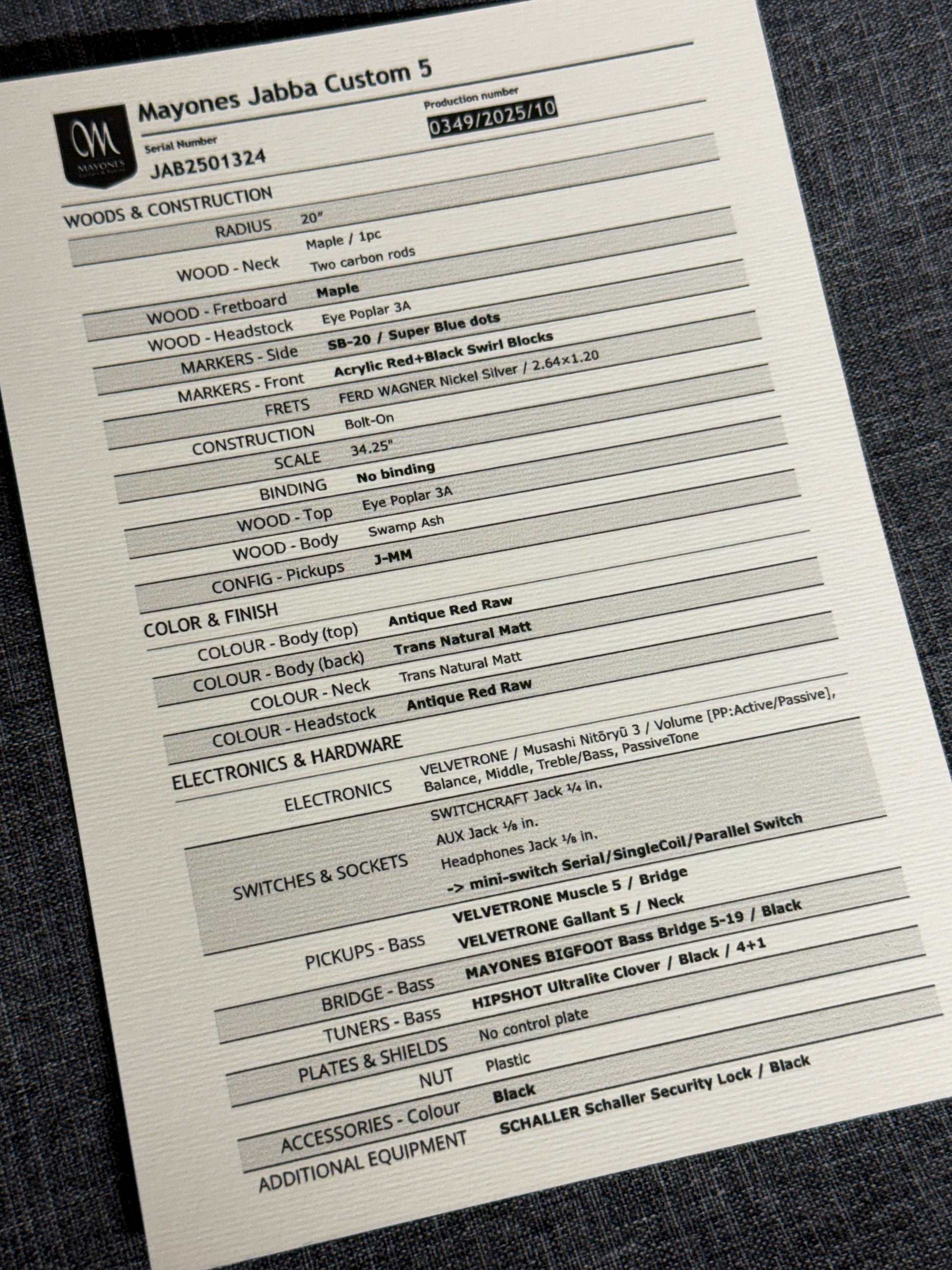 This particular build takes things to another level with a stunning Eye Poplar 3A top in Antique Red Raw, paired with a Swamp Ash body for the perfect balance of attack and warmth. The Maple neck and fretboard keep things snappy and articulate, while the 34.25" scale offers tight, controlled low end without sacrificing comfort. Fit and finish throughout is exactly what players have come to expect from Mayones — flawless fretwork, dead-on tuning stability, and a level of attention you simply don’t get from factory instruments.