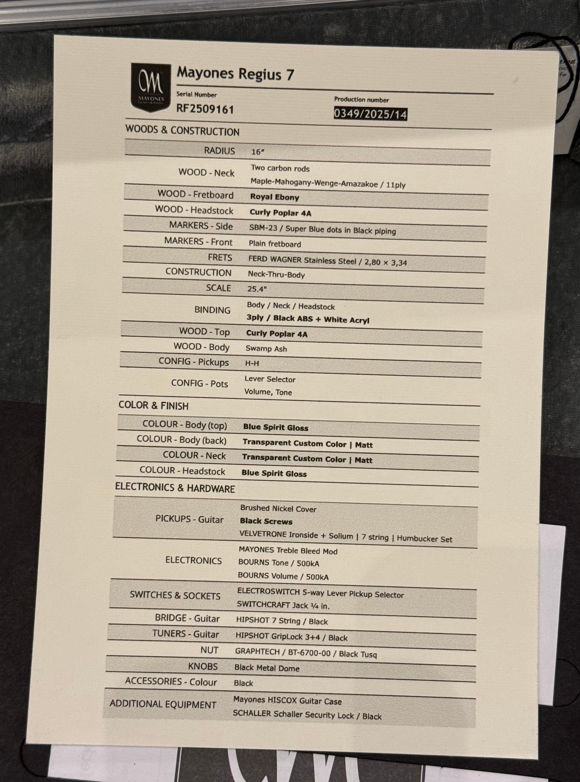 Finished with Hipshot hardware, Grip-Lock tuners, and a black-and-white 3-ply binding, the Regius 7 Blue Spirit embodies everything that defines Mayones: world-class tone, unmatched playability, and modern boutique design. Whether you’re on stage, in the studio, or collecting the finest instruments, this Regius 7 stands as one of the most visually and sonically stunning guitars Mayones has ever built.
