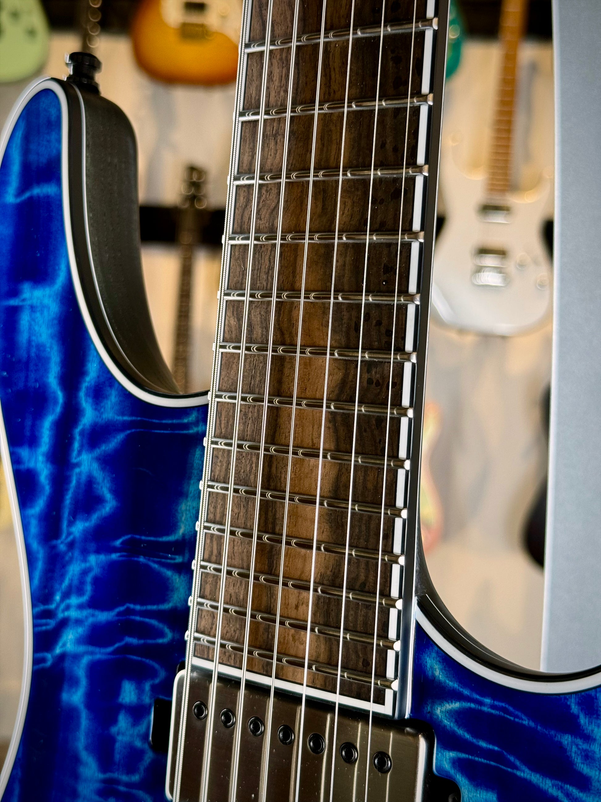 Tonally, this Regius is powerful yet refined. The Velvetrone Ironside & Solium humbuckers deliver exceptional clarity, punch, and balance across all seven strings — from shimmering cleans to tight, percussive rhythm tones and searing leads. It’s a guitar that feels as alive and expressive as it looks.