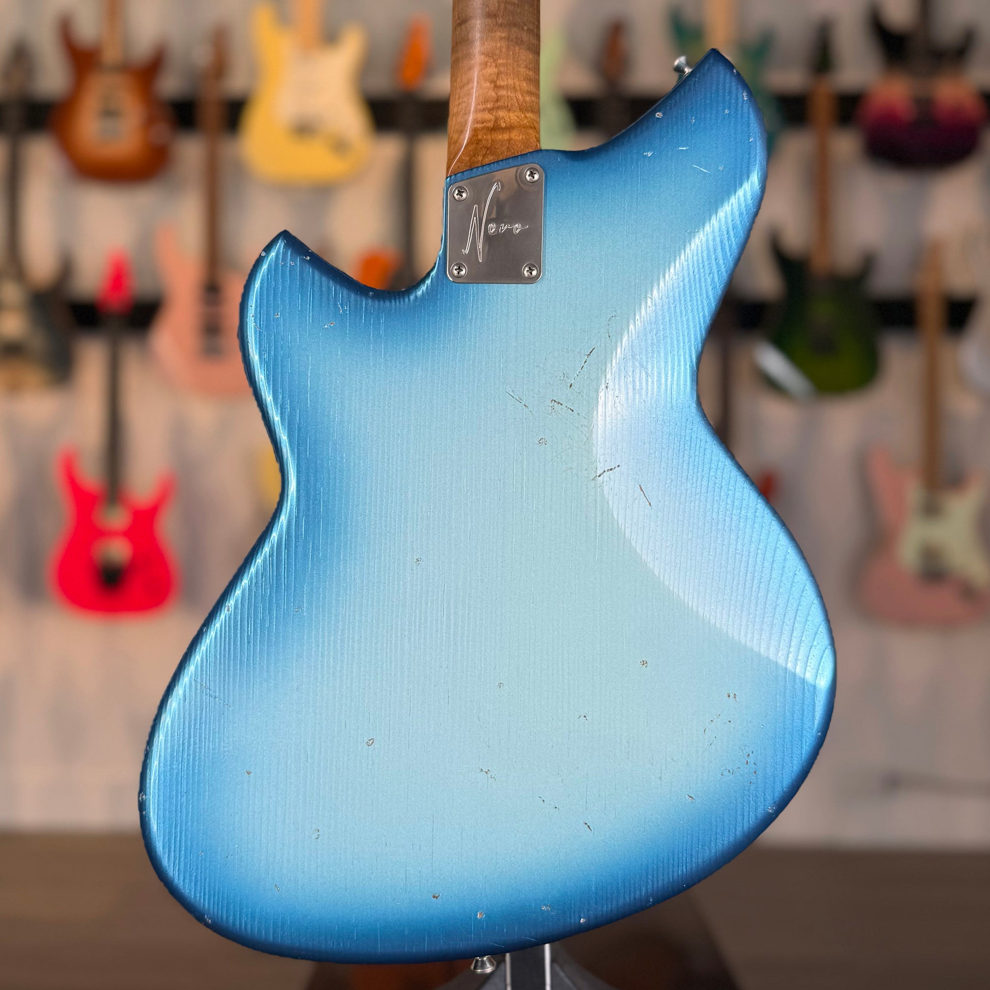 The Novo Serus J Custom in Lake Sonic Burst is a perfect blend of character, feel, and visual depth. The finish is stunning in person — a layered blue burst that moves from rich, saturated edges into a lighter, almost translucent center, with a soft metallic glow that shifts under different light. It feels watery, dimensional, and organic, giving the guitar a vintage-meets-modern presence that photographs beautifully and looks even better in hand.