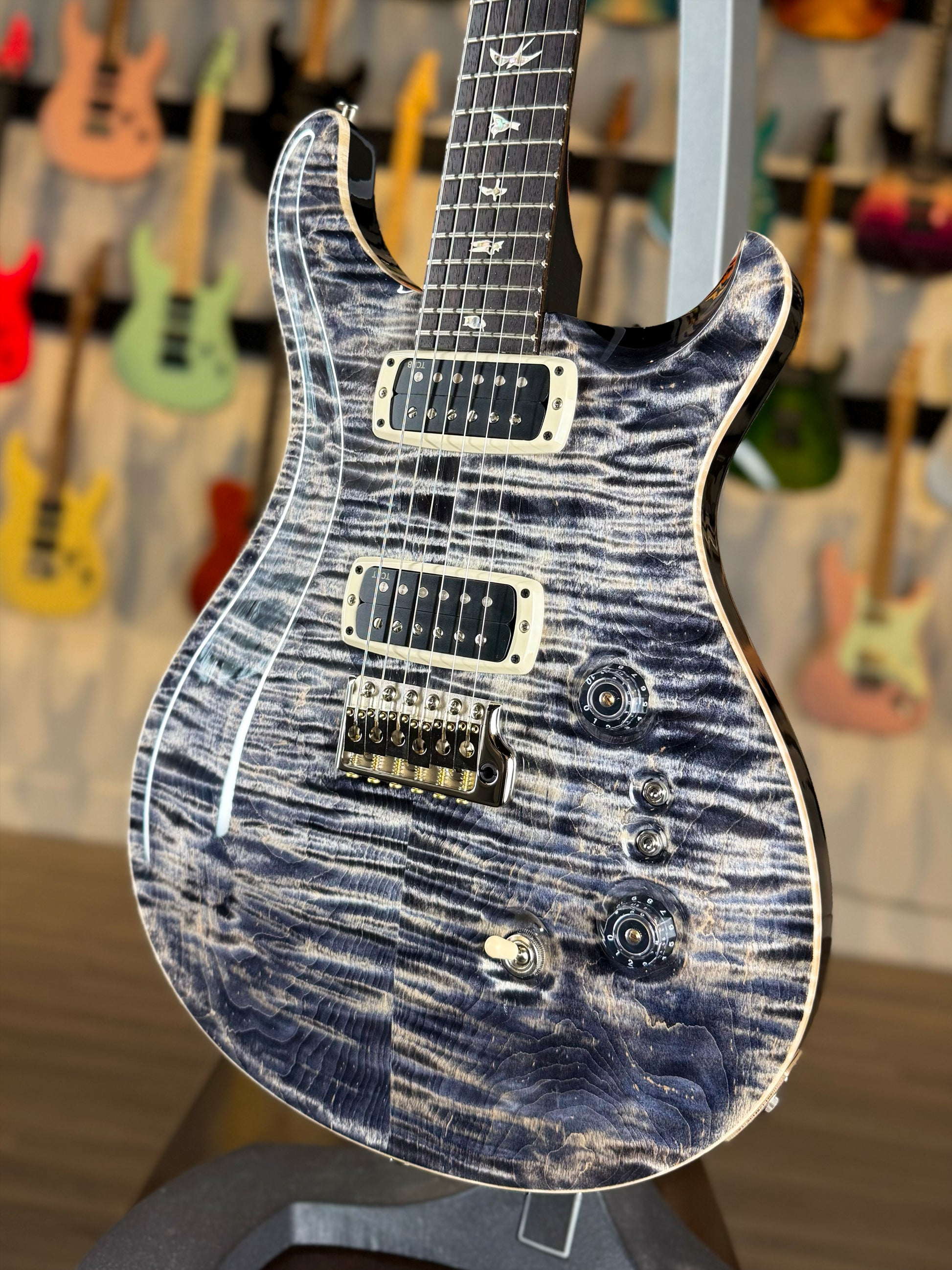 Up front, the guitar features a faded indigo/charcoal top over a stunning Flame Maple select carve, with depth and movement that feels almost liquid. The figure comes alive under light, shifting and rolling as you move the guitar. Flip it over and things get even wilder: the back is finished in a Silver Microburst that’s absolutely insane — bright, metallic, and futuristic, yet still refined. It’s a finish you rarely (if ever) see on a Custom 24, and it completely transforms the instrument’s presence.
