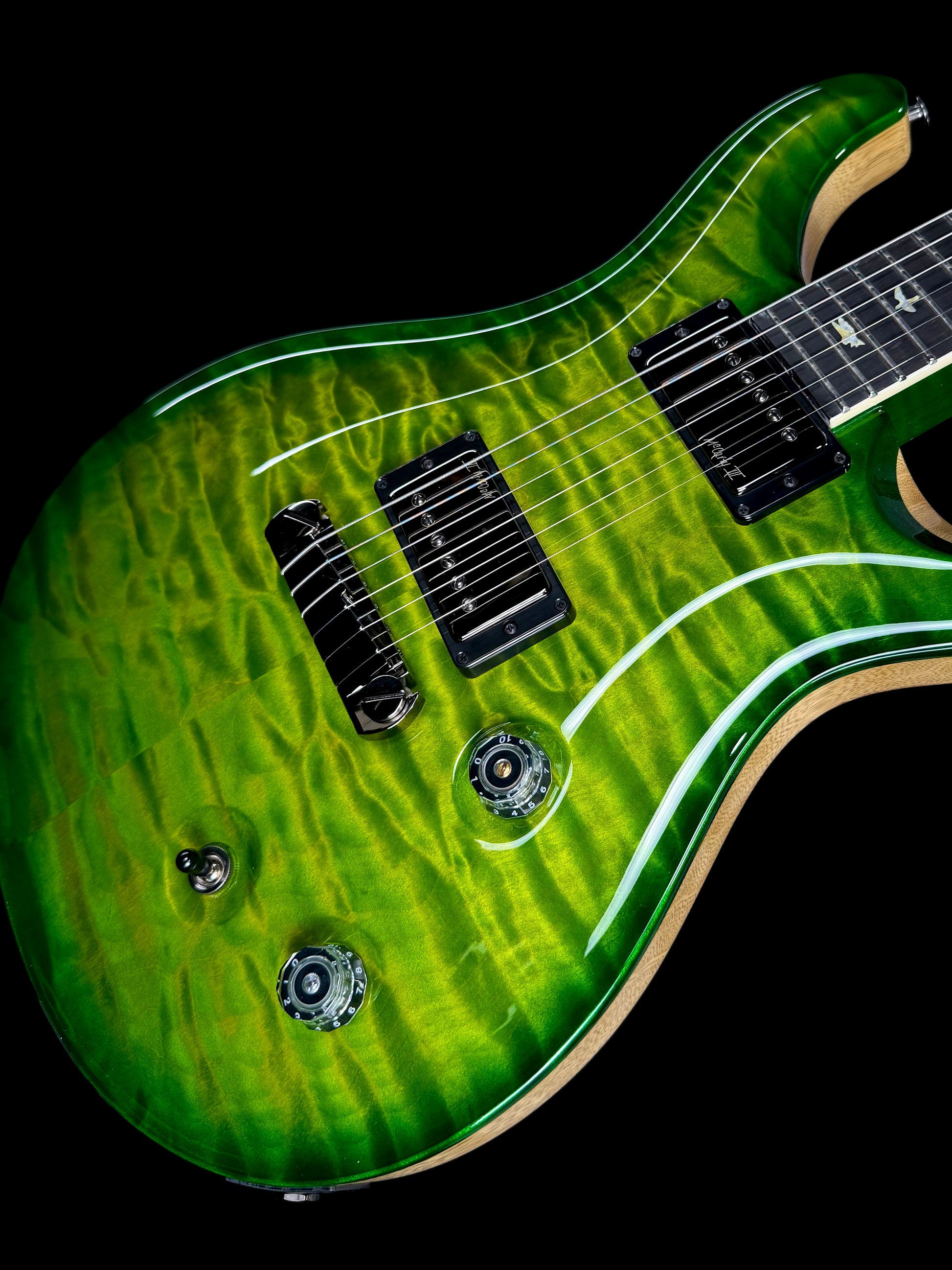 This isn’t just any McCarty—it’s a PRS Wood Library build with features that push it far beyond the standard lineup. The 10-Top quilt maple cap is nothing short of stunning, paired with a curly maple neck that’s been stained to perfectly match the breathtaking Eriza Verde finish. The result is a guitar with both jaw-dropping looks and premium tonal character.