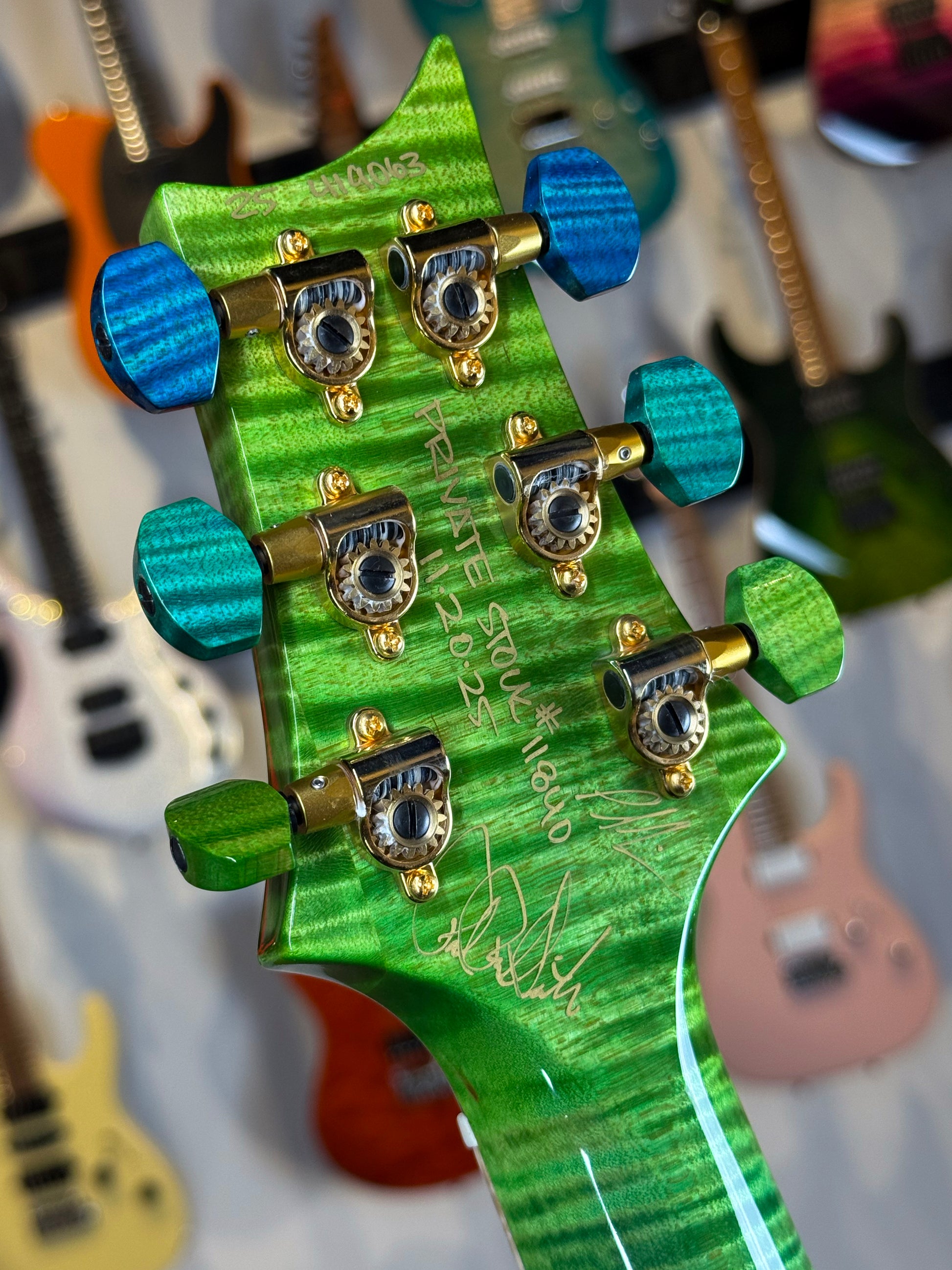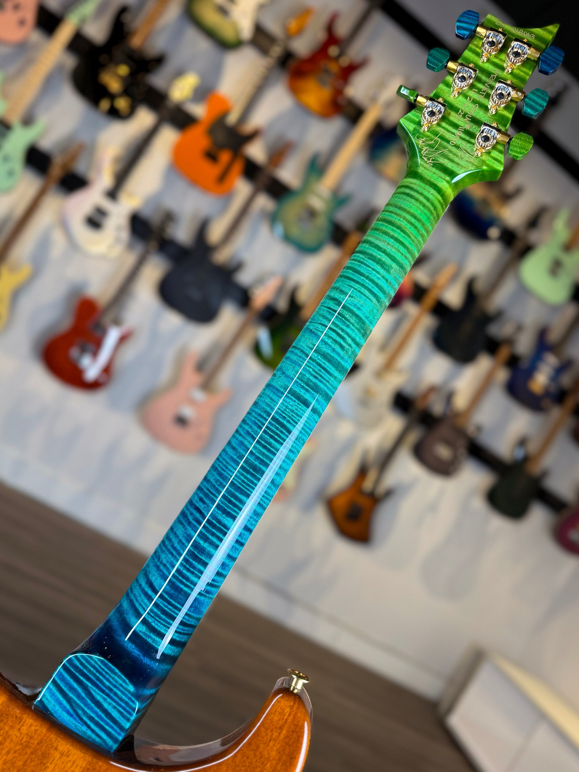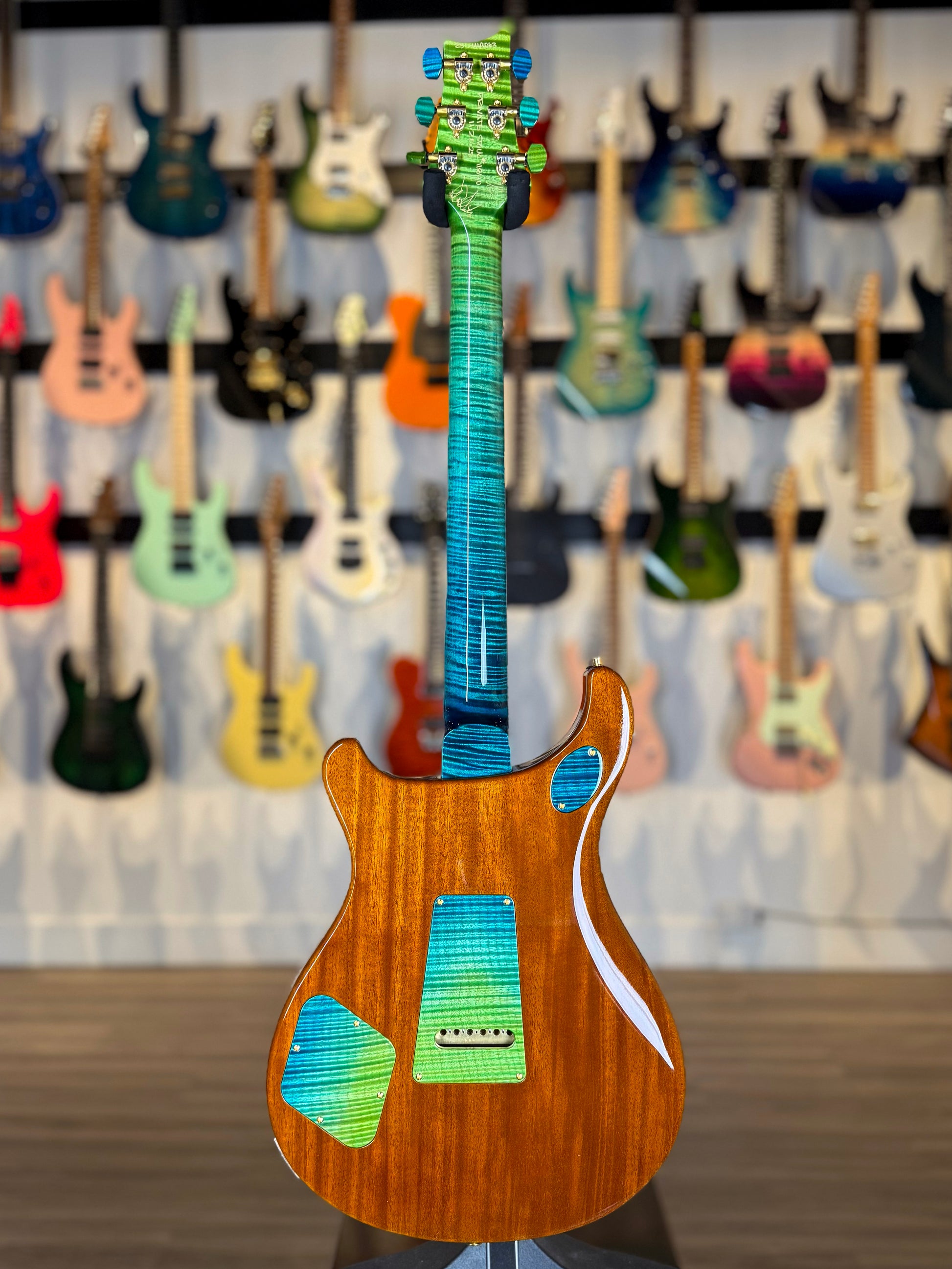 But what truly sets this guitar apart is the finish. Laguna Dragon’s Breath is already one of the most demanding stains in the Private Stock palette — but this one is different. The gradient from deep ocean blue into vivid emerald is flawless and the flame in the maple amplifies the transition like motion under glass. Without exaggeration, this is one of the finest Laguna Dragon’s Breath executions we have ever seen — visually perfect, symmetrically ideal, and tonally enhanced by the top it was matched to. If you’ve been waiting for the example of this finish, this is it.
