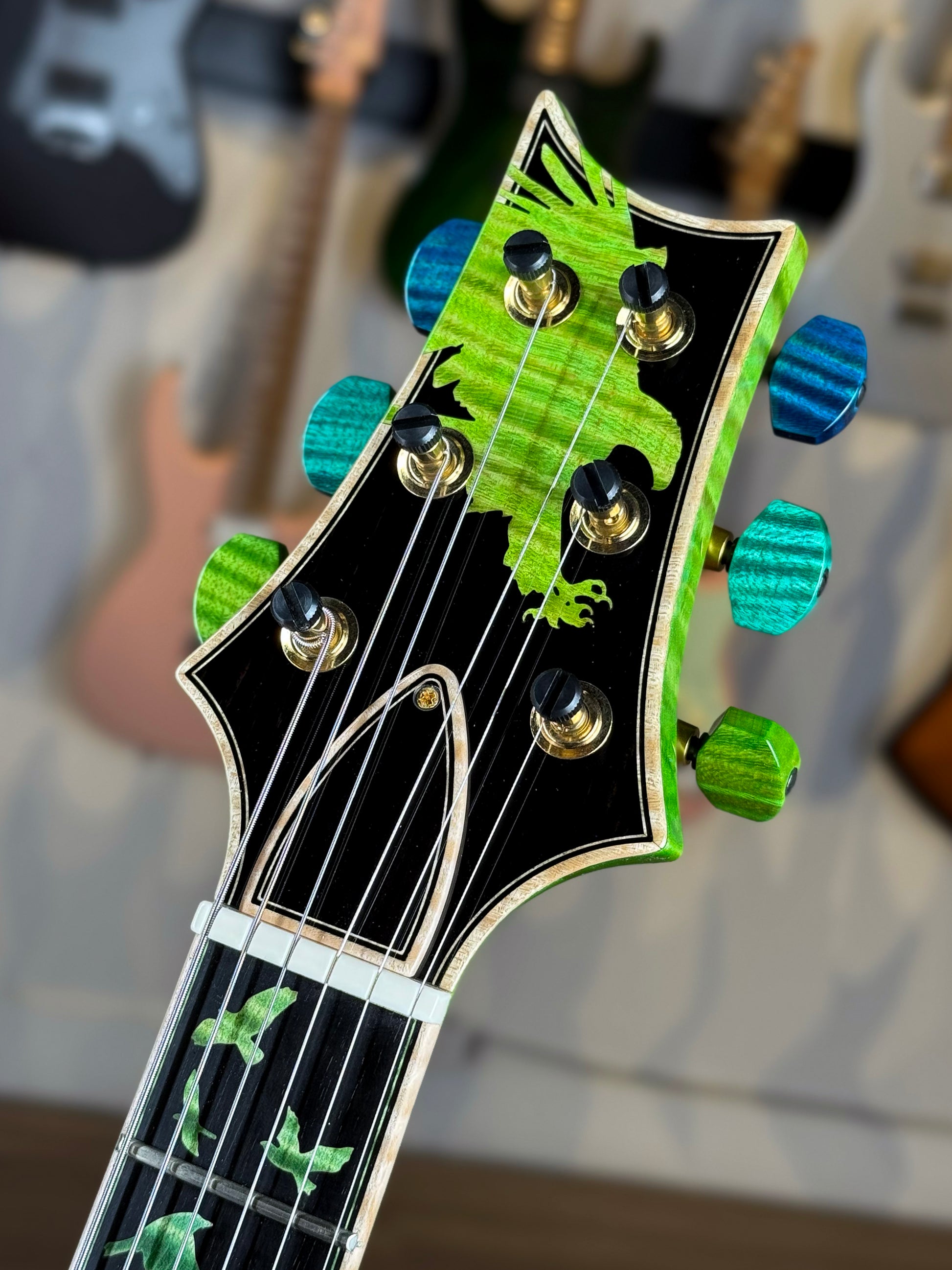 And then there’s the inlay work. The reverse “Birds of a Feather” package on a split Curly Maple/Ebony board is one of the most intricate upgrades PRS offers. Each bird is individually cut and seated, forming a mosaic that dissolves into the stained maple end of the board. Because two different woods are involved, alignment, grain, and color matching become exponentially more difficult — and that’s exactly why collectors chase this option. It turns the neck into moving artwork and ties the entire color palette together from headstock to heel.