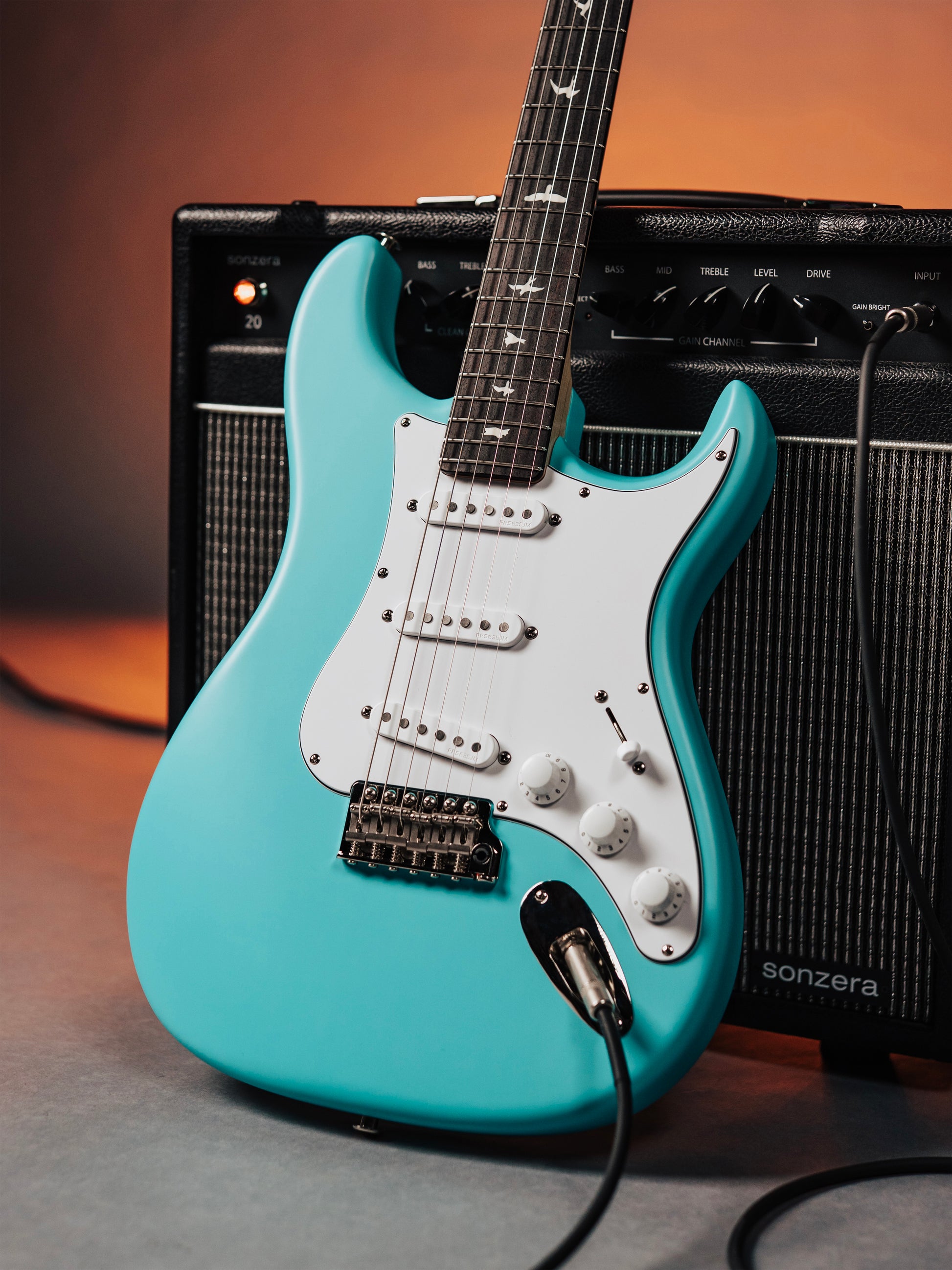 Underneath the finish, this is the Silver Sky formula players swear by: an alder body, a 25.5" scale maple neck, a rosewood board with a vintage-correct 7.25” radius, small bird inlays, and of course the 635JM single coils—full, warm, chimey, and never ice-picky. PRS rounds it out with a satin nitro finish that feels played-in from day one, a steel trem with Gen III knife-edge screws, a bone nut, and vintage-style locking tuners for rock-solid performance.